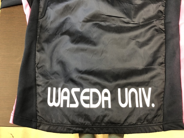 背中の裾には、WASEDA UNIV.と圧着ラバーシートの加工をしました。